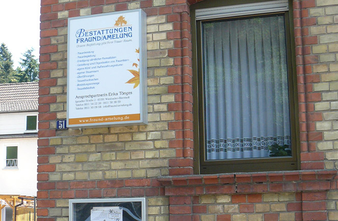 Um die Leistungen von Bestattungen Fraund/Amelung vor Ort anbieten zu können haben wir seit dem Jahr 2000 in der Niedernhausener Straße 51 einen Standort für Rambach mit einem Aushang geschaffen. Auch bei der Bestattungsvorsorge sind wir Ihr Ansprechpartner in Rambach.
